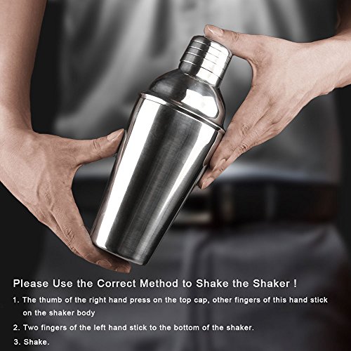 HOW TO USE COCKTAIL SHAKER CORRECTLY? Wine liquid won't leak if apply the correct way to shake the cocktail shaker. (As the above picture showed) 1. The thumb of the right hand press on the top cap, other fingers of this hand stick on the shaker body. 2. Two fingers of the left hand stick to the bottom of the shaker. 3. Shake.