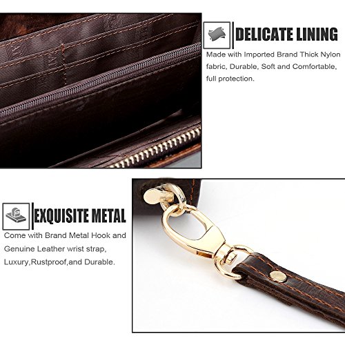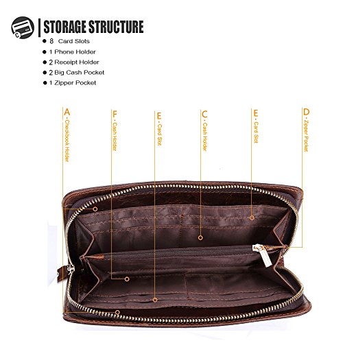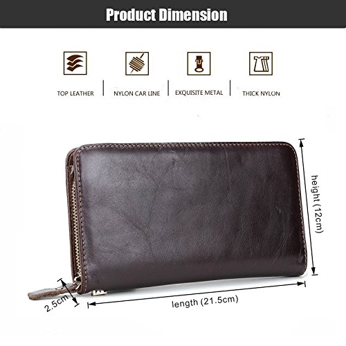 - Feature : Material: 100% First layer Cowhide Genuine Leather, Wonderful Hand-Made workmanship, elegant in texture and soft to the touch, durable and luxury. / Size: 21.5cm×12cm×2.5cm / Come with Brand Metal Zipper with Genuine Leather Wrist Strap, Luxury, Rustproof, Smoothly and Durable / Structure: : The Main sections comes with a zipper closure, it has 8 card slots, 2 receipt holder, and 2 cash holder which you can put it for hold 5.5'' cell-phone or less. / This wallet is gorgeous with its fashionable style, it can be used in both business and casual occasion.