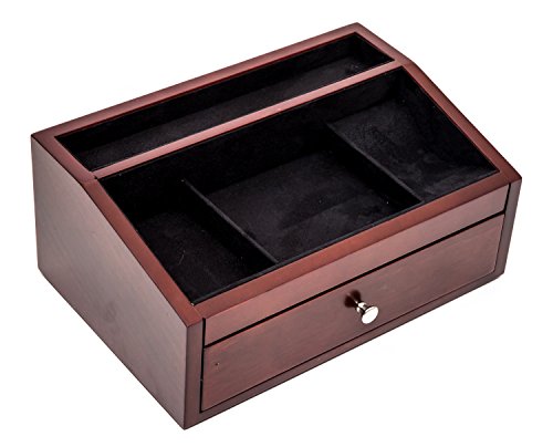 This handsome men's valet box is crafted of mahogany and lined with black material. The valet has one drawer with a ring and cufflink roll there is a large area for watches and more.