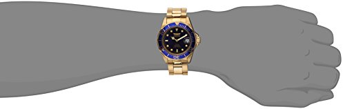 Studio : Invicta Publisher : Invicta Binding : Watch Amazon.com With the affordable gold-tone Invicta Pro Diver automatic men's watch, you can still afford to buy flippers and a pair of goggles. It features a shock-resistant, 21-jewel automatic movement that will stand up to the rigors of your undersea adventures, and it's water resistant to 660 feet. The watch case and stainless steel bracelet band are both plated with 23 karat yellow gold, and mix brushed and polished finishes. The navy blue dial includes large Tritnite luminous markers and hands, and a date window at 3 o'clock with a magnifier. Other features include a unidirectional rotating bezel with elapsed time markings, fold-over clasp with safety, and a durable mineral crystal. Pro Diver Collection Automatic Watches