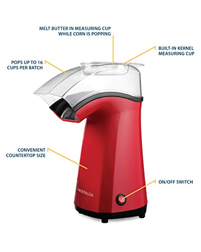 It's time to bring healthy back to snack time! The unique popping chamber design creates a swirling airflow, using hot air instead of oil to produce a light and healthy snack. Includes a built-in measuring cap to ensure the proper amount of kernels are used, and the clear top housing allows for easy viewing. Measuring cap also works great for melting butter!Feature