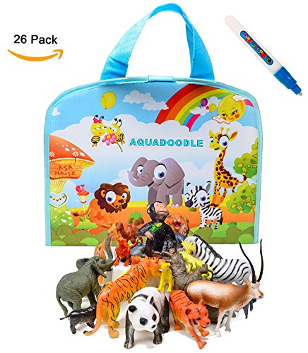 The bundle includes: 1 Travel n Doodle Pad, 1 Aquadoodle Magic Pen,24 pieces Zoo animals action figures toys measure 2 and 5 inches in length, plus an Ebook to teach your kids about the wild safari animals, wildlife and nature.