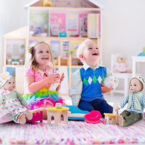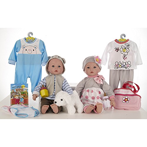 These two huggable baby dolls come dressed in adorable coordinating outfits. One of the first things you will notice when you see these two baby dolls in person is their happy and expressive faces and bright blue eyes. Each set comes with two outfits for each baby, two diapers, diaper bag, bottles and a 16-page story book.