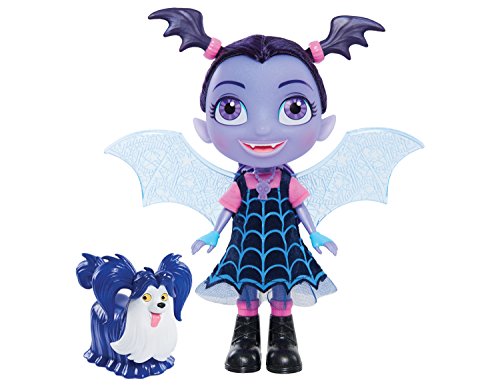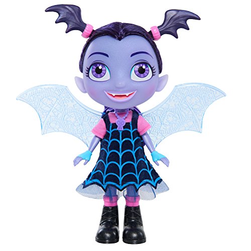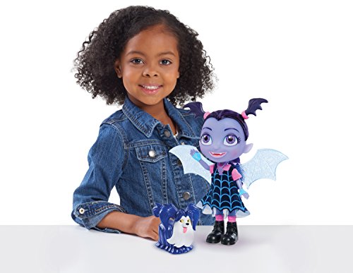 From the new Disney Junior series, Vampirina, comes a Spook-tacular new hero named Vampirina – a girl vampire who's new in town and learning how to fit in while also being true to herself. The Bat-tastic Vampirina doll celebrates a fang-tastic best friend, who may look different, but is just like you! Press Vampirina's necklace to hear her say fun phrases from the show! Uh-oh! Looks like Vampirina has a "Case of the "Battys!" Hear bat-tastic sound effects as she "swoops," "loops" and "flies" around with her boo-tiful light-up bat wings! Vampirina comes with her loyal pal, Wolfie, and is dressed in a spook-tastic web-detailed dress with matching necklace. Ages 3+.Feature