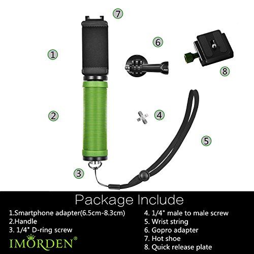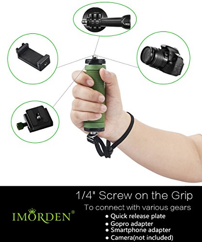 3, The light but strong IMORDEN hand grip, with 1/4'' screw, Gopro and smartphone adapters included, offers you a firm and comfortable handle and keeps your cameras, smartphones, or Gopro steady.