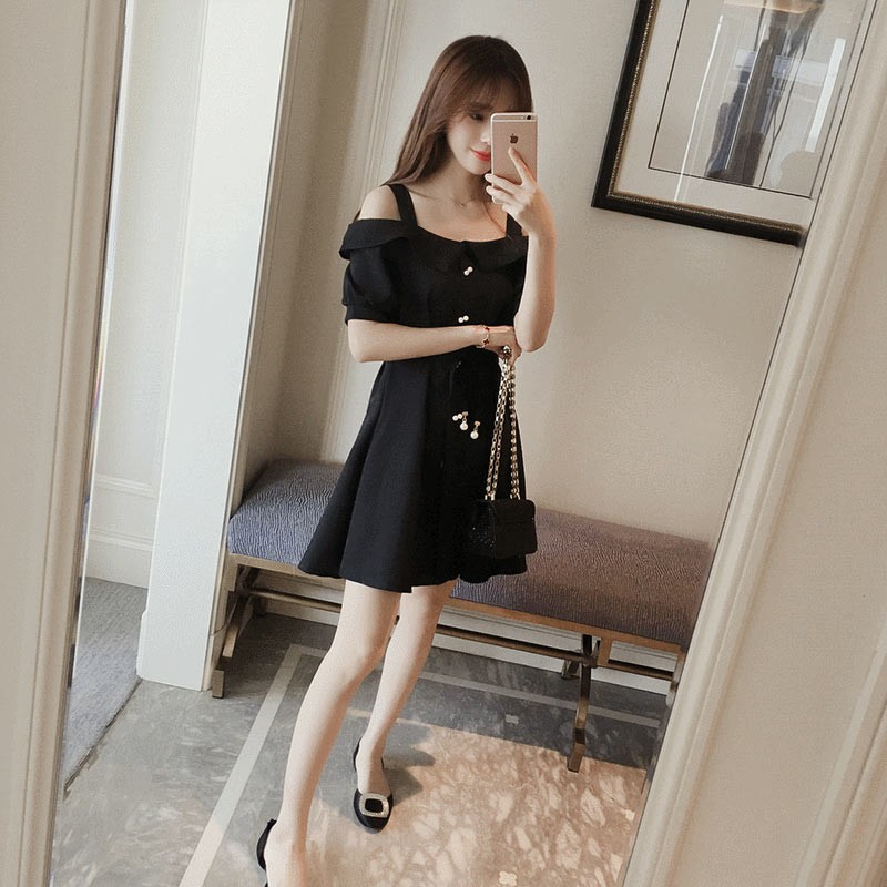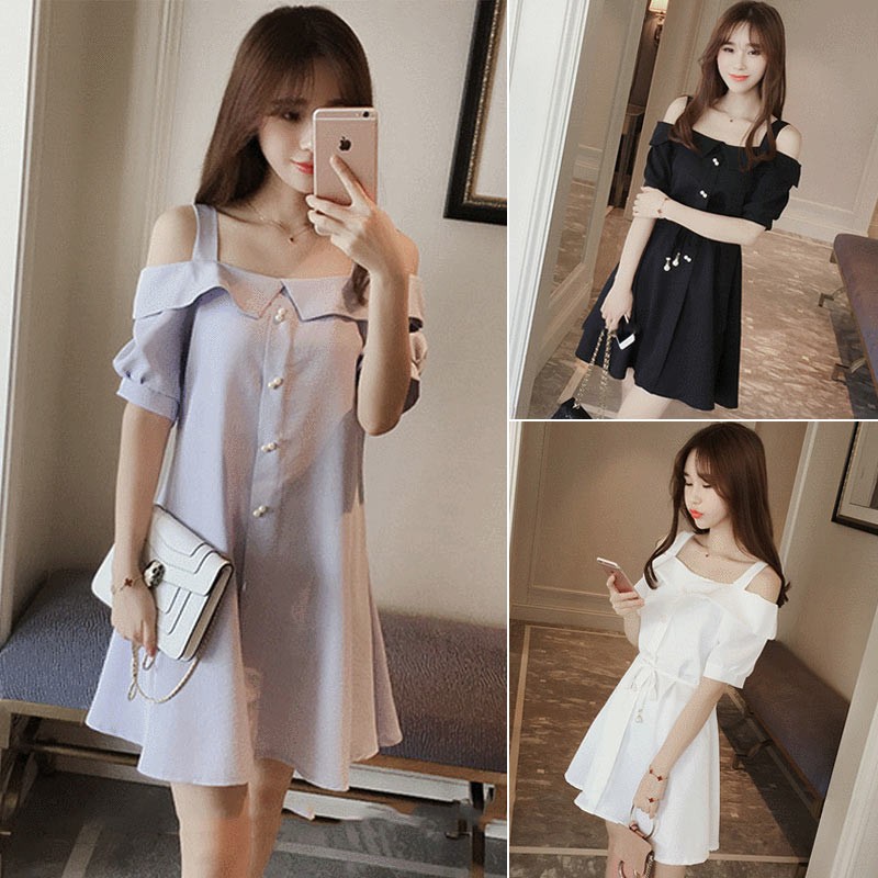 袖付きの太めのストラップ・オープンショルダーデザインワンピース♪