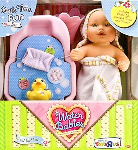 -. Feature : Waterbabies Splash 'n Fun Newborn Water Baby Doll Exclusive Playset / Its bath time! Fill this adorable Newborn doll with warm water and she feels just like a real baby! / Comes with everything you need to give your baby doll a bath! / Includes a Newborn doll with hooded towel, bathtub, rubber ducky, washcloth, and pretend baby lotion & baby shampoo bottles / Give your baby a bath just like a real mommy! Ages 3+