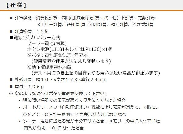 | 税率8%から10%にワンタッチ切替できます。その他の税率にも対応可能。税率を自由に設定できます。「税抜」「税込」キーで税計算もラクラク♪オートパワーオフ機能で操作終了後、約8分で自動電源オフになります。ソーラー&ボタン電池のダブルパワー電源です。 |