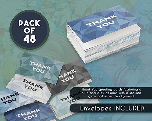 -. Feature : THANK YOU CARDS BOX SET: 48 pack of every occasion thank you greeting cards featuring 6 blue and grey designs with a stained glass patterned background. / BLANK ON THE INSIDE: Contains 48 blank cards to include your custom messages for business and personal use. / SUPERIOR QUALITY: Each card is printed on high-quality ivory board paper card stock for elegance and extra durability. / BULK SUPPLY: Ensure you always have greeting cards on hand for when occasions arise throughout the year. / DIMENSIONS: Each card measures 4 x 6 inches. Includes 48 corresponding V-flap, white envelopes.