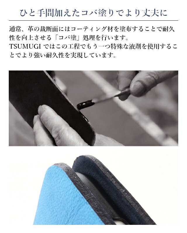 | 山羊革 【藍染プレミアムレザー素材について】 日本独自の伝統的な手法により生み出される藍染プレミアムレザーです。職人による技術と手間を掛けてなめされたレザーで、 深みのある色味や質感を表現しています。 本革製なので革の表面に細かなキズがつきやすいですが、そのようなキズも味わいとして経年変化(エイジング)をお楽しみ頂けます。 | |