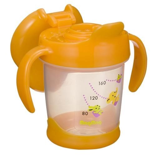 まだ上手にコップ飲みできない赤ちゃんでも安心の飲み口です。ゆるやかなカーブが口の脇からのこぼれを防ぎます。8ヵ月ごろの赤ちゃんが操作しやすいストレートのハンドルです。飲み口から出る量を調節できるつまみがついています。フタがついているので、持ち運びにも便利です。 |