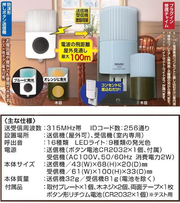 ボタンを押すと、離れた場所へ光とチャイムでお知らせ。受信機は、暗い場所でナイトライトになります。 |