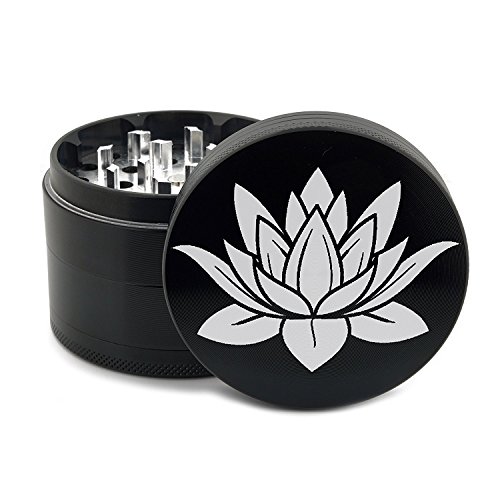 Lotus Herb Grinder Black 4 Piece Grinders Premium Grade Metal Grinders 2.5" 63mm - Engraved Flower Design - Gift Box