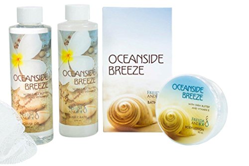 Tub: The Oceanside Breeze Bath Spa Set comes in a blue plastic, vintage-style bathtub. The ocean theme lends the feeling of relaxing at an ocean spa. The spa set with the bathtub holder is a 2-in-1 gift that that can be used for display or as a toy, especially in a children's bathroom! Contents: 150ml shower gel 150ml bubble bath 50ml body lotion 120g bath salt White puff, ribbon & hantag Color: Blue About this Fragrance: Pacific means calm, and this luxurious bath set, encased in a Pacific Blue tub, will be like floating in a sea of calm, stress-free pleasure. Treat that special person to the most luxuriously indulging bath experience. Each Freida&Joe Spa Gift Basket transports that fortunate recipient to some far-off intriguing and exotic location. As soothing, calm escapes from stress, the Spa Gift Sets moisturize and refresh the body, and revitalize the mind and spirit. Expressing your love, lifting someone's spirits, or just letting that special person know you are thinking about him or she has no designated day. The unique quality and distinctive fragrances of all Freida & Joe's products express perfectly and always that person is special to you.Feature