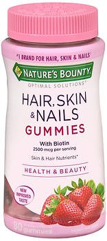 -. Feature : Looking good and feeling great has never been this delicious! Nature's Bounty Optimal Solutions Hair, Skin & Nails Gummies contain just the right balance of nutrients to support lustrous hair, healthy nails and vibrant skin, all in a delicious strawberry flavored gummy.* Nature's Bounty Optimal Solutions Hair, Skin & Nails gummies provides you with vital nutrients your body needs to support your natural beauty from within.* Vitamin E and Vitamin C are antioxidants.