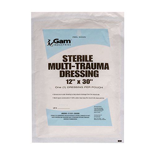 Dmi sterile multi-trauma dressing. Outer dressing collects drainage from the wound site and disperses it within the pad. Cotton and rayon fibers are embedded in layers of cellulose wadding to keep the injured person and rescuer clean and dry. Sterile and individually packaged. 12" x 30". 0 |