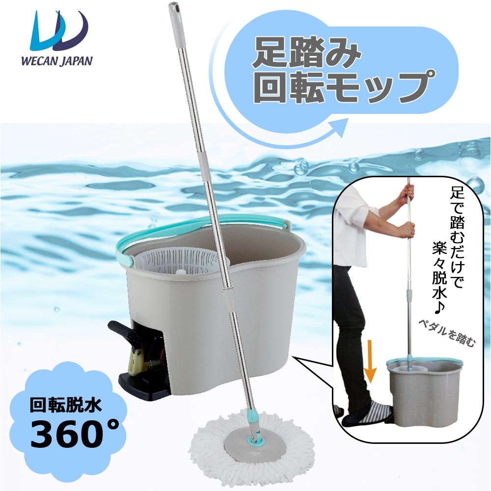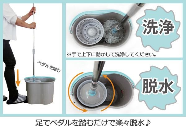 モップを本体バケツにセットし足でペダルを踏むだけで脱水ができる回転モップです。手を汚すことなく楽にお掃除していただけます♪ |