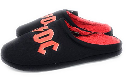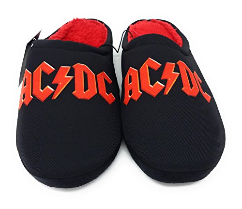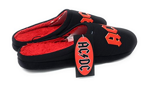-. Binding : Apparel -. Brand : Bioworld -. Color : Black -. Department : mens -. Feature : Men's rock band AC/DC slip on slippers / Slippers have an open back so they can easily be slipped on and off / Solid sole so they can be worn outside for light use / Great holiday gift idea for fans of AC/DC and older rock bands / Slippers are black with AC DC in red -. ProductGroup : Shoes -. ProductTypeName : SHOES -. Title : Men's AC/DC Music Band Slip On Slippers