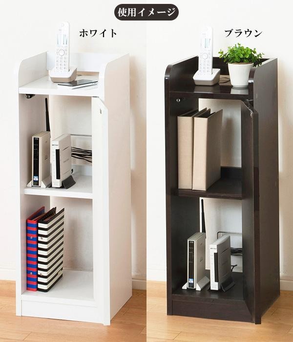 | 幅が約30cmとスリムなので、お部屋のスミや家具のスキマに設置できます。扉内はモデムやルーター、光電話の機器、タップなどまとめて収納でき、乱雑になりがちなコードをスッキリ整理できます。またA4ファイルや電話帳を立てて収納することもできます。 |