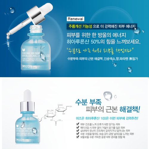 Mizons Hyaluronic Acid Ampoule is part of Original Skin Energy Ampoules that is an essential factor solution for your skins problem areas. Through its wrinkle improvement, achieve stronger, robust skin energy. And by filling skin with abundant, deeply rich moisture, it takes responsibility of the inside of your skin as well. Its hydration improves skin elasticity, texture, and firms to create glossy, healthy skin without a sticky mess. For those with skin without a lot of moisture, the ampoule should be a fundament part of your skin care.Feature