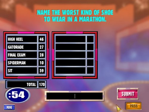 It's time to play the Family Feud (TM) - the fast-paced game based on the successful TV game show. Two games for one low price! Try to guess what 100 people said when they answered our survey questions. Beat the average score -- or go head-to-head with a friend or an entire family! Pass, Play, Steal and Strike. Hours of fun with over 2,000 questions and 10,000 answers in each game! Survey says: Let's play Family Feud (TM)!
