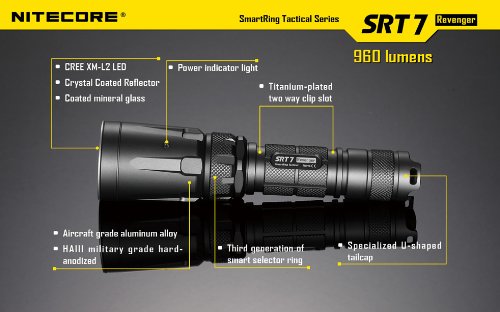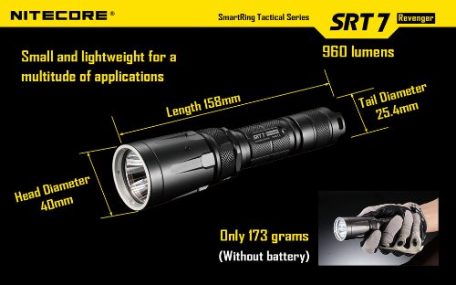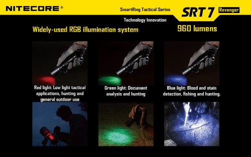 Studio : NiteCore Publisher : NiteCore Binding : Sports Product Description Nitecore SRT7 features industry-leading third generation Smart Selector Ring Technology, provides you a smooth and rapidly infinitely variable brightness adjustment from 0 to 960 lumens. The revolutionary built-in Red, Green and Blue LED's offers the unique tactical versatility.