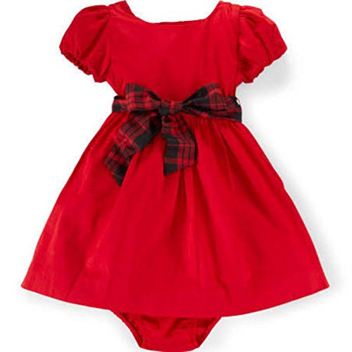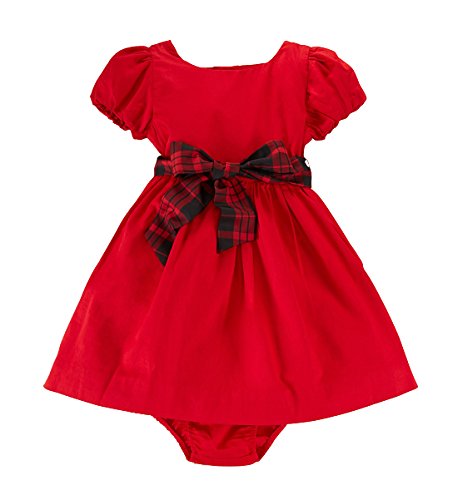 Crisp cotton sateen, a plaid grosgrain sash at the waist and a matching bloomer make this fit-and-flare dress from Ralph Lauren a picture-perfect style for birthday parties and family photos.