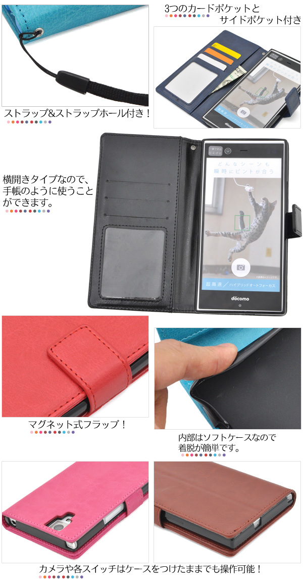 | 製品仕様 | | 対応機種 | arrows NX F-02H | | カラー | ホワイト・レッド・ブラック・ライトブルー ブラウン・ビビッドピンク・オレンジ・ブルー | | 素材 | 合皮(PUレザー)/TPU | | 注意 | ※本製品はマグネットを使用しておりますのでクレジットカードなどの磁気カードの収納は避け、カードの注意事項をよくご確認の上ご使用ください。 読み取り等ができなくなる恐れがあります。 ※本製品に収納された、カードのデータ等が喪失された場合におきましても、 当社では一切保証致しかねます。 ※長時間接触していたり、強い力で擦れるとスマートフォンに色移りする場合がございます。 ※本製品をスマートフォンに装着する際には本体や本製品に付着したゴミやホコリをよく取り除いてください。 ホコリ等がついたまま装着すると、スマートフォンに傷がつく恐れがあります。 ※ 本製品は強い衝撃からスマートフォンを保護することは出来ません。 |