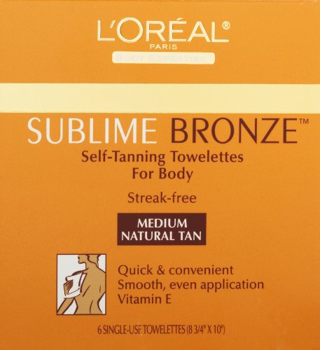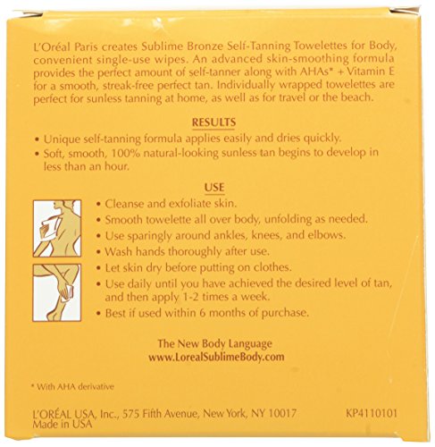 Convenient and easy to use, these Sublime Bronze Towelettes for Body create a streak-free, natural looking tan. With enough self-tanner for one application, each towelette is perfect for at home or on the go. Made with Vitamin E and gentle Alpha Hydroxyl Acid (AHA) derivative to provide beautiful, 100% natural-looking tan and ultra-smooth skin. Your tan will be two shades darker than your natural skin tone. Results may vary. Continue to use Sublime Bronze until you have reached your desired level of tan.Feature