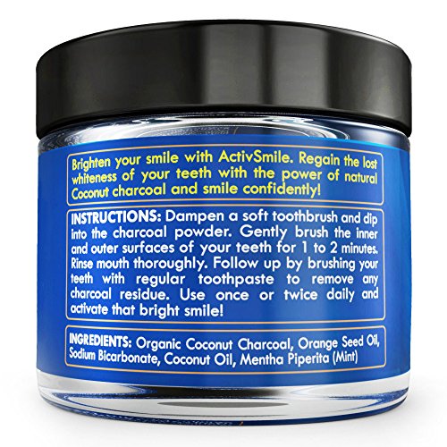 Derived from the highest-quality coconut sources, ActivSmile's activated charcoal formula is safe to use for whitening your teeth, while being easy on your gums. ActiveSmile naturally whitens your teeth, without the presence of harsh, dental-grade whitening peroxides. Experience the power of Activated Charcoal, one of nature's best purifiers and detoxifiers! Satisfaction is 100% guaranteed or your money back!