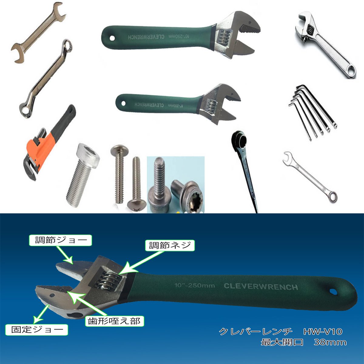 Clever wrench You can also remove broken bolts Rust allows you to take nuts and bolts Collapse grooves collapsed and can also be fitted with rounded screw threads Can also take nuts and bolts solidified by rust Continuous work Easy manual handling