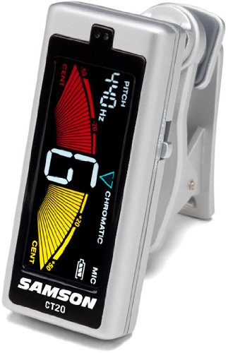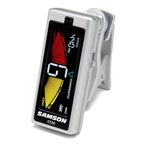 The Samson CT20 Clip On Guitar Tuner combines precision tuning capabilities with a hands-free design that makes accurately tuning guitars, basses, stringed, woodwind and brass instruments easier than ever. The CT20 is a fantastic tuner at a great price! The Samson CT20 tuner attaches securely to your guitar and bass headstocks, as well as any other stringed or wind instrument, for hands-free tuning both live performance situations and during rehearsals. Stemming from the rear of the tuner, this dual 360 degrees ball-jointed clip allows you to view the display at any angle. In addition, the tuner's design includes a large, full color LCD display for tuning in any environment, even on stage. With the goal of keeping your instruments sounding performance-ready at all times, the CT20 is packed with comprehensive tuning capabilities. It generates a smooth, real-time response with precise tuning accuracy that can be calibrated between 410 and 490 Hz. The CT20 offers chromatic, guitar and bass tuning scales, as well as a built-in mic and piezo sensor. This allows you to tune your acoustic instruments via pitch and your powered gear by vibration. Also, the CT20 clip on tuner puts a flat tuning/transposition setting at your fingertips. Powered by an included single CR2032 battery, the Samson CT20 clip on tuner provides two operating modes for maximizing battery life. After 10 seconds of inactivity, the tuner automatically enters an energy-saving mode that dims the display without shutting off the tuner. And the unit will power off completely if it is not used for 10 minutes. Samson's CT20 Clip-On Tuner's compact design helps to make it the ultimate tuning accessory that every musician will want in their instrument case, gig bag or back pocket.Feature