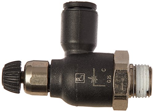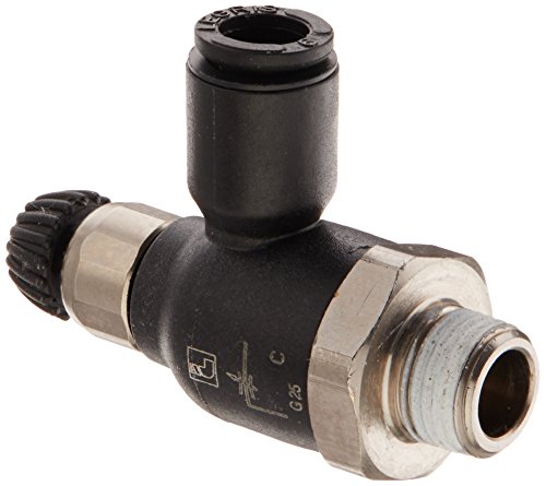 This Parker Legris 7067 series flow control valve is housed in a banjo-style body with a 90-degree angle and is suitable for use in metering bidirectional air flow in pneumatic applications. A knobbed screw with a locking nut is used to adjust air flow on the inlet and outlet sides. The nylon banjo body is impact-resistant, the nickel-plated brass threaded fitting is corrosion-resistant, and the nitrile butadiene rubber (NBR) O-ring is resistant to oil and chemicals. The banjo body has a female push-to-connect tubing end and the housed nickel-plated fitting has a male British Standard Pipe Taper (BSPT) thread with a sealing O-ring. It has a maximum operating pressure of 145 pounds per square inch (psi) and a working temperature range of 32 to 158 degrees F. The valve complies with the Council of the European Union 2006/42/EC directive and the Pressure Equipment Directive (PED) 97/23/EC standards for safety and complies with Reduction of Hazardous Substances (RoHS) regulations. This air flow control valve is suitable for use in pneumatic applications such as in laboratories, food and beverage processing, and paint and printing industries.