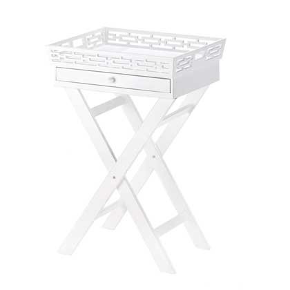 -. Feature : The tray makes itself at home atop the x-leg side table that features a handy pull-out drawer for storage, and both pieces are finished in shabby chic white with distressed edging detail / Item weight: 9.6 lbs. Overall: 19" x 14½" x 26 5/8" high; tray: 19" x 14½" x 2¾" high; drawer: 17¾" x 13¼" x 2¾" high. MDF wood.