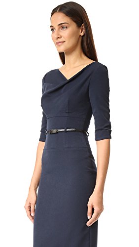 -. Feature : Sheath dress with three-quarter sleeves featuring belted waist and asymmetric draped neckline / Decorative seaming / Vent at skirt / Scoop back with hidden zipper
