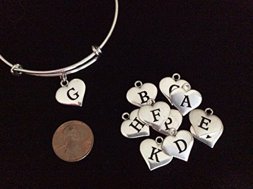 -. Title : Stamped Heart Letter Initial Charm Expandable Silver Bracelet