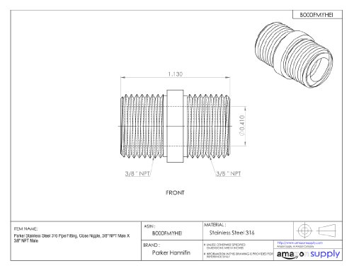 Parker Stainless Steel 316 Pipe Fitting, Close Nipple, 3/8" NPT Male, 1-7/16" Length