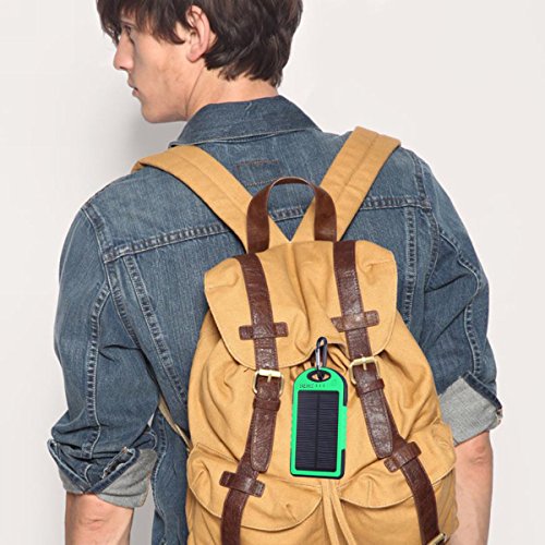 - Feature : Made of eco-friendly silicone rubber and ABS + PC material, and with rubber paint surface process. / Football grain design has anti-skid protecting effect.Water resistant design ensures the device functions smoothly when it's raining; Shock-proof feature ensures the device work properly even it crashes or drops. / With the free hook included, you may hang it on your backpack for long flights, road trips, hiking, camping, or such, handy to carry and charge by solar. / The USB ports are well protected by rubber caps, to further keep them away from water and safe to charge smartphones, tablets, or any other 5V USB-charged devices. / Please kindly note that it's comparatively slow for the solar charger to recharge itself via solar power, due to the limited surface of the solar panel.