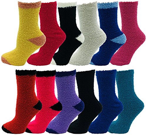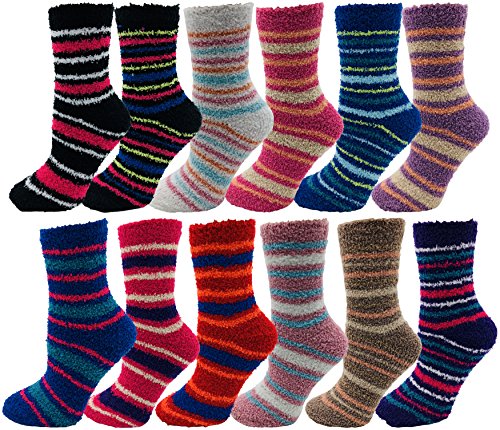 -. Feature : FUZZY SOCKS FOR WOMEN: Get 12 pairs of womens fuzzy socks in this bulk pack deal. Comes in assorted colors, stripes, or gripper bot. A hygienic alternative to going bare feet. / WOMENS WARM SOCKS: Great for wearing around the house and lounging in. Very comfortable soft polyester keeps your feet feeling warm and cozy all year long. Also great to sleep with being that it's so fluffy! / HOUSE SOCKS: Great for wearing in the winter and all other seasons. Whether you're watching TV, cooking, or simply walking around home, these socks are the perfect companions to keep your feet happy. / SOFT SOCKS: Sock size 9-11 will fit womens shoe sizes 5-11 and are crew length. Your feet will love these fuzzy socks. / COMFORTABLE & SNUG: Made with 98% polyester and 2% spandex. Machine wash warm. Do not bleach. Remove bard with scissors. **Colors may vary**