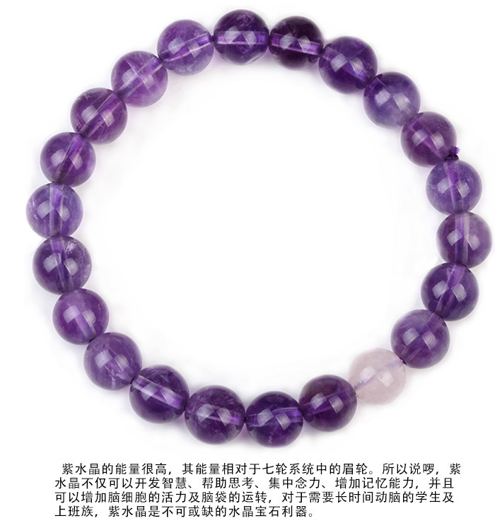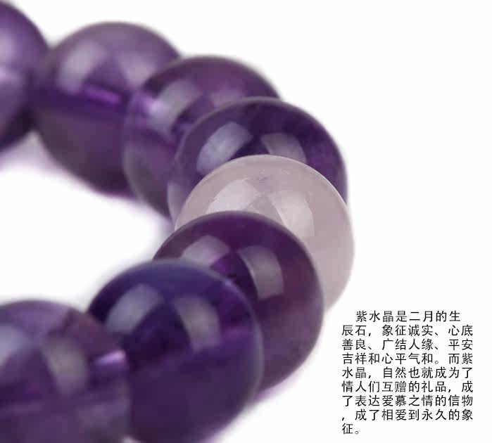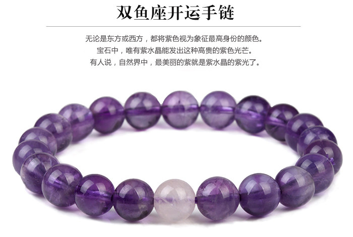 产品特点:紫水晶代表灵性、精神、高层次的爱意,可作对仰慕者的一种定情物、信物。紫水晶作为传统意义上的护身符,通常可驱赶邪运、增强个人运气,并能促进智能,平稳情绪,提高直觉力、帮助思考、集中注意力、增强记忆力,给人勇气与力量。紫色主宰右脑世界,即直觉与潜意识,促使其精神集中,提高思维活力,使人能在困扰中沉着思考,冷静面对现实的挑战。产品相关介绍:名称:十二星座双鱼座开运手链材质:紫水晶尺寸:珠径约0.6cm、总长约9cm重量:约16g 包装:吉祥物专用包装