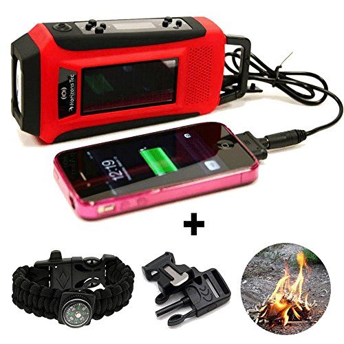 HORIZONS TEC HT-747 EMERGENCY NOAA WEATHER RADIO. SOLAR & HAND CRANK POWERED, MOBILE CELL PHONE CHARGER & LED FLASHLIGHT. PARACORD SURVIVAL KIT BRACELET MAGNESIUM FLINT FIRE STARTER COMPASS WHISTLE