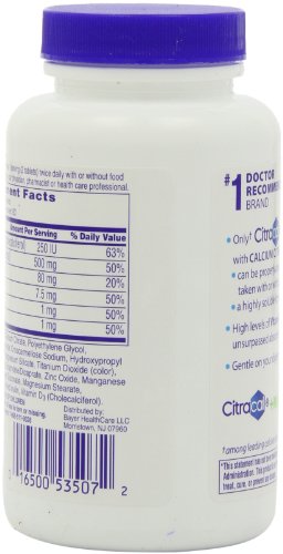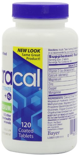 -. Binding : Health and Beauty -. Brand : Citracal -. EAN : 0885376730191 -. Feature : Clinically proven to help reduce the rate of bone loss / Are highly soluble, bioavailable, and usable by the body & Contain added Vitamin D which improves absorption / Citracal contains no wheat, barley, yeast or rye, and is dairy and gluten free. / Citracal can be taken anytime, with or without food. -. IsAdultProduct : 0 -. Label : Citracal -. LegalDisclaimer : IN NO EVENT, REGARDLESS OF CAUSE, SHALL ALL STAR SALES BE LIABLE FOR ANY INDIRECT, SPECIAL, INCIDENTAL, PUNITIVE OR CONSEQUENTIAL DAMAGES OF ANY KIND, WHETHER ARISING UNDER BREACH OF CONTRACT, TORT (INCLUDING NEGLIGENCE), STRICT LIABILITY OR OTHERWISE, AND WHETHER BASED ON THIS AGREEMENT OR OTHERWISE, EVEN IF ADVISED OF THE POSSIBILITY OF SUCH DAMAGES. ALL STARS SALES HOLDS NO LIABILITY FOR ANY DAMAGES OR PROBLEMS FROM USE OF ANY PRODUCTS SOLD, AS WE ARE A THIRD PARTY SELLER. ALL PRODUCTS MUST BE USED AS DIRECTED AND AT YOUR OWN RISK OF RESPONSIBILITY. -. Manufacturer : Citracal -. Model : BAYER415810 -. MPN : 53507 -. NumberOfItems : 1 -. PackageQuantity : 1 -. PartNumber : 53507 -. ProductGroup : Health and Beauty -. ProductTypeName : HEALTH_PERSONAL_CARE -. PublicationDate : 2010-09-21 -. Publisher : Citracal -. Size : 120 -. Studio : Citracal -. Title : Citracal Calcium Citrate with Vitamin D Plus Magnesium 120 ea -. UPC : 811139616105