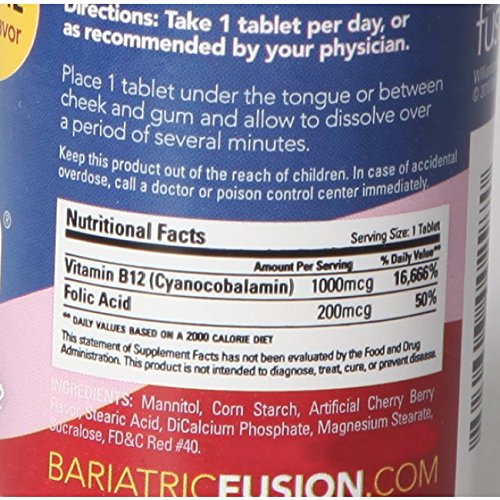 This great tasting sublingual formulation delivers 1000 mcg of B12 and 200 mcg of Folic Acid in each tablet. Our quick dissolving preparation will help prevent and correct B12 and Folate deficiencies after all weight loss procedures.Feature