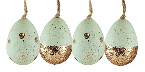 -. Binding : Kitchen -. Brand : Creative Co-op -. Color : Green -. EAN : 0807472917283 -. Feature : Set of 4 Hanging Christmas Ornaments / Size: 2.25" / Made of plastic with string attached for hanging / Features two glitter dipped and two glitter polka dotted egg shaped ornaments. / A wonderful gift idea for any loved one this Holiday Season! -. IsAutographed : 0 -. Label : Creative Co-op -. Manufacturer : Creative Co-op -. PackageQuantity : 4 -. ProductGroup : Home -. ProductTypeName : HOME -. Publisher : Creative Co-op -. Studio : Creative Co-op -. Title : Easter Egg Mint & Gold Glitter Hanging Ornaments - Set of 4 -. UPC : 807472917283