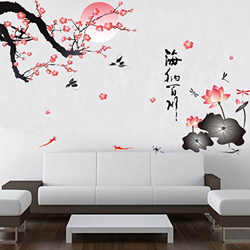 BIBITIME All River Into the Sea Plum Blossom Lotus Flowers Birds Chinese Wall Sticker for Living Room Mural art Decal