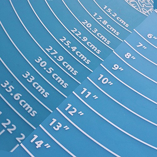 GUIDE RINGS AND RULER- The mat is printed with pastry guide rings so you can get the perfect shape you need without cracking out the tape measure. If you need even dough strips, it even has measurements printed in inches and cm which is perfect for cutting out even lattice strips or icing laces! Guide rings diameter measures from 6" - 14" and 12.5cm - 35.6cm / Length size markings measure from 1" - 18" and 1cm - 43cm / Width size markings measure from 1" - 15" and 1cm to 35cm