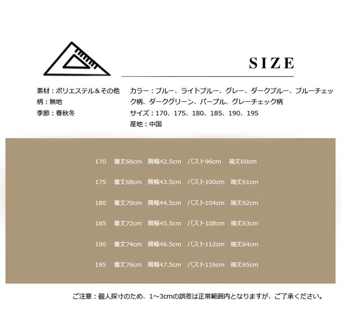 テーラードジャケット メンズ 秋冬 アウター ショート丈 大きいサイズ コート カラージャケット 無地 フォーマル オフィス 通勤 春夏秋冬 テーラードジャケット メンズ 春 アウター商品詳細素材:ポリエステル&その他柄:無地季節:春秋冬カラー:ブルー、ライトブルー、グレー、ダークブルー、ブルーチェック柄、ダークグリーン、パープル、グレーチェック柄サイズ:170、175、180、185、190、195産地:中国サイズ参照表170 着丈66cm 肩幅42.5cm バスト96cm 袖丈60cm175 着丈68cm 肩幅43.5cm バスト100cm 袖丈61cm180 着丈70cm 肩幅44.5cm バスト104cm 袖丈62cm185 着丈72cm 肩幅45.5cm バスト108cm 袖丈63cm190 着丈74cm 肩幅46.5cm バスト112cm 袖丈64cm195 着丈76cm 肩幅47.5cm バスト116cm 袖丈65cmご注意:個人採寸のため、1~3cmの誤差は正常範囲内となりますが、ご了承ください。テーラードジャケット メンズ 秋冬 アウター ショート丈 大きいサイズ コート カラージャケット 無地 フォーマル オフィス 通勤 春夏秋冬 テーラードジャケット メンズ 春 アウター