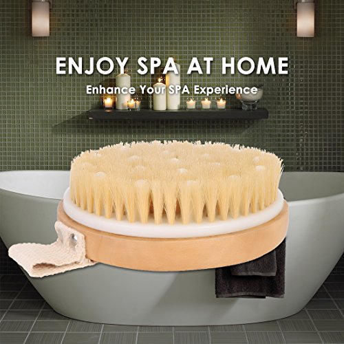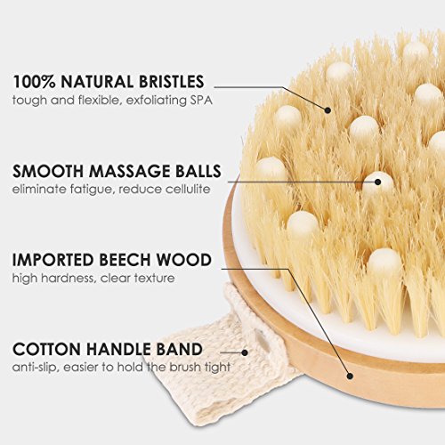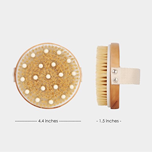 -. Feature : ★100% NATURAL BRISTLES: This dry / wet body brush made of 100% pure natural bristles which are perfectly firm without being rough enough to scratch your skin. / ★EXFOLIATE SKIN: This body brush exfoliate your skin and give it a healthful glow, remove any dead skin cells, Improves skin's health and beauty. / ★REDUCE CELLULITE: This brush's massage nodes are wonderful at helping improve lymphatic drainage and removing toxins from the body system, also helping encourage a reduction in that unsightly cellulite. / ★ELIMINATE FATIGUE: By using this body brush, you can enjoy a personal SPA to stimulates blood circulation and have a relaxation. / ★QUALITY GUARANTEE: To make sure we give you the best in versatility and durability, we offer 1 year money back guarantee to ensure complete satisfaction & risk free.