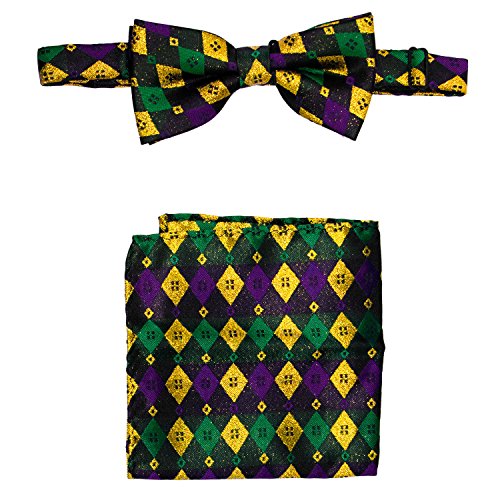 Product DescriptionMardi Gras Green, Purple, and Gold Metallic Bow Tie and Handkerchief Set0