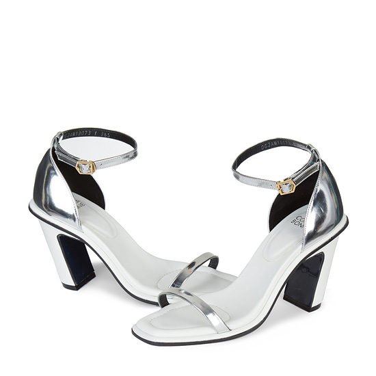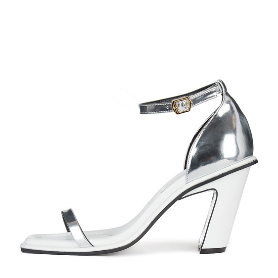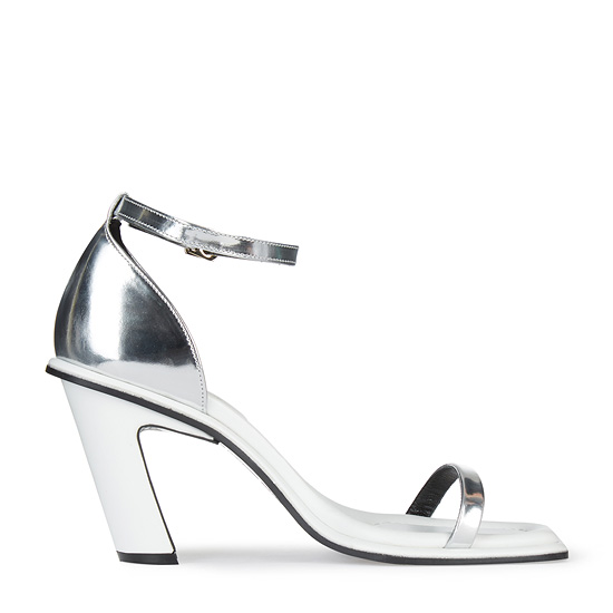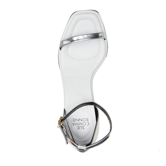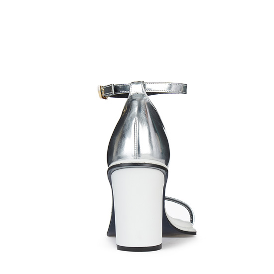 - 세련된 실버와 화이트 컬러를 조합한 오픈 토 샌들.